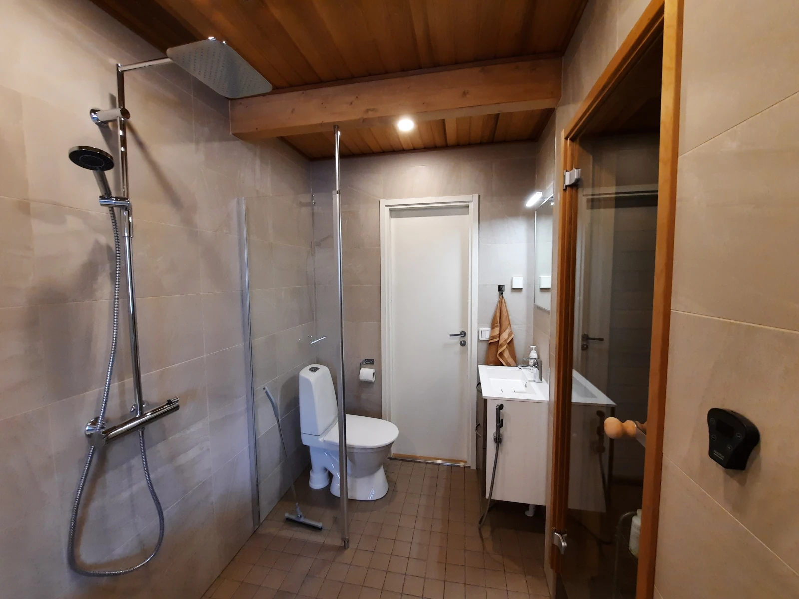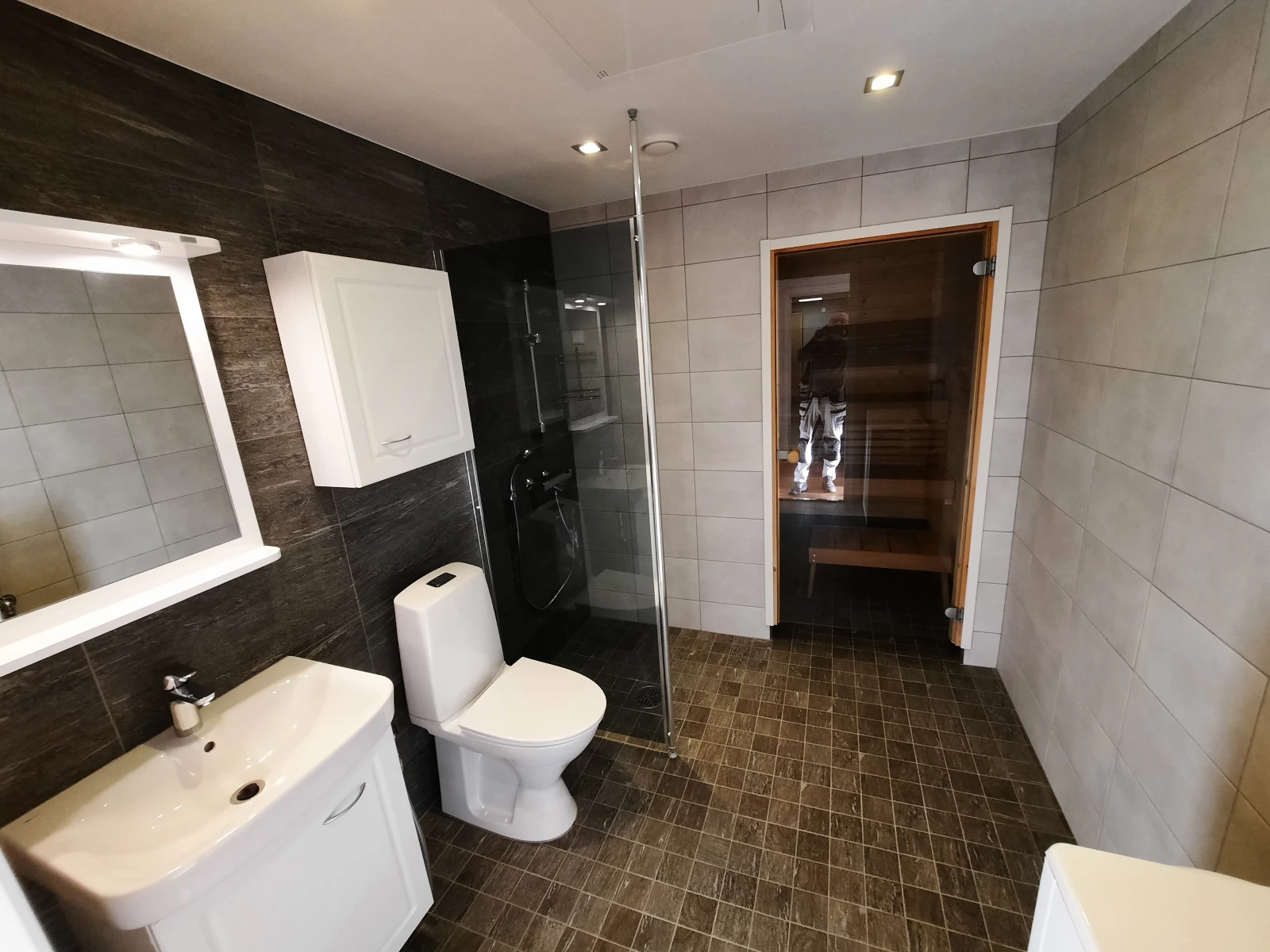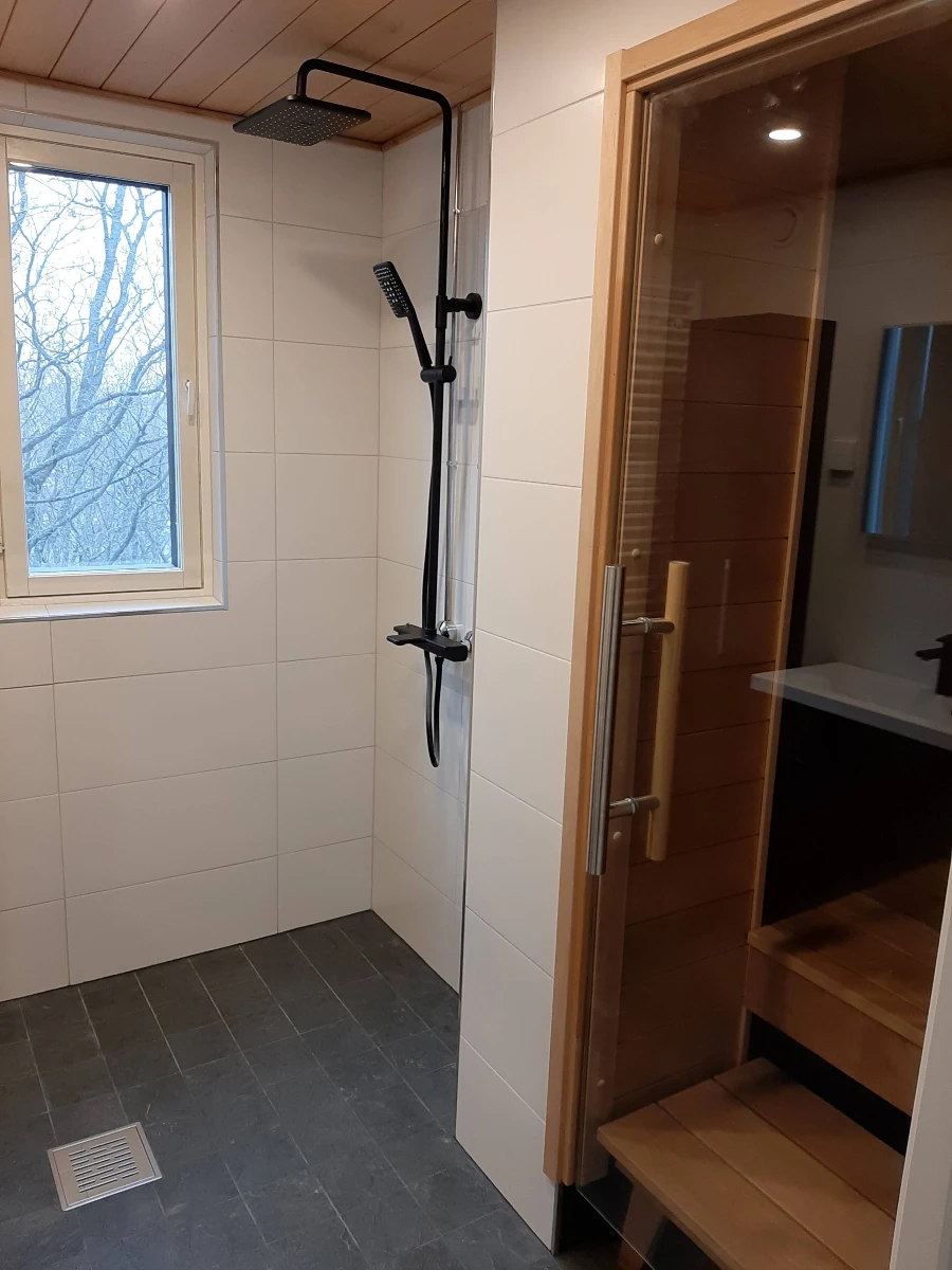 Asennamme kalusteet, suihkuseinät, suihkut, hanat, wc-istuimet ja saunan lauteet sekä kiukaan.